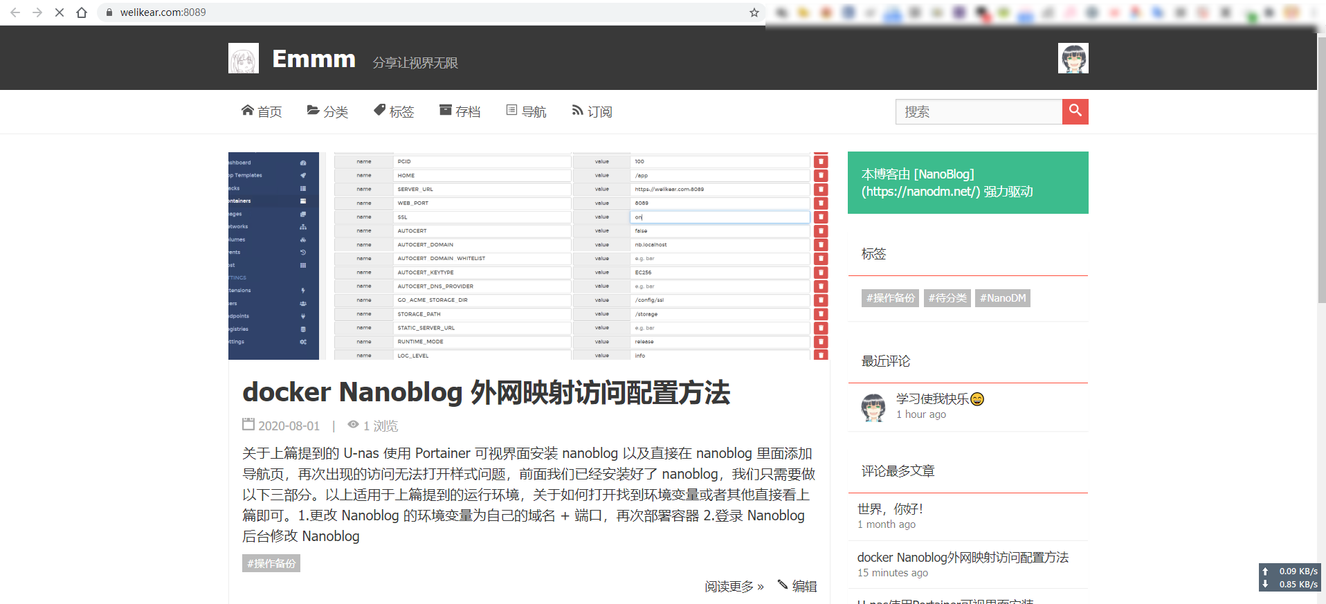 关于上篇提到的[U-nas使用Portainer可视界面安装nanoblog以及直接在nanoblog里面添加导航页],外网访问的时候我再次出现的访问无法打开样式问题,前面我们已经安装好了nanoblog,我们只需要做以下4步。